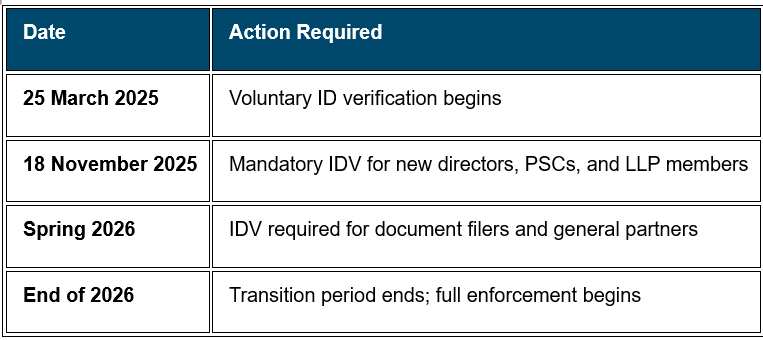 The Economic Crime and Corporate Transparency Act 2023 (the Act) introduces a new era of corporate accountability in the UK. In two of our previous articles from March 2025 and November 2023, we explored the broader reforms introduced by the Act — including the push for greater transparency and the overhaul of Companies House powers. Now, with the mandatory identity verification (IDV) regime coming into force this month – a move designed to enhance transparency, reduce fraud, and prevent misuse of UK corporate structures, it’s time to focus on what businesses must do to comply.